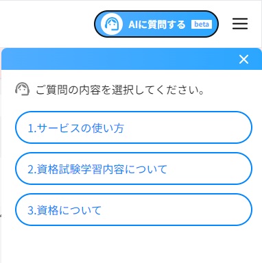 2024.11.19システム更新会員ならだれでも使える「AI質問機能」をリリースShikaku Passの会員の方に向けて、「AI質問機能」のご提供を開始しました。AI質問機能とはShikaku Passの使い方や、講座の学習内容の質問にお答えできる機能です。会員ならだれでもご利用いただけます。(無料体験含む)使い方ログイン後、ページ上部の「AIに質問する」ボタンからご利用いただけます。→ログインはこちら今後ともShikaku Passをどうぞよろしくお願いいたします。