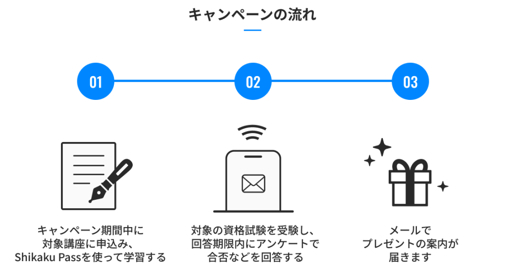 購入対象期間中にShikaku Passで講座を購入したうえで、アンケート回答期限までに当該講座の資格を受験しアンケートに回答いただいた方に、以下の特典をお送りいたします。