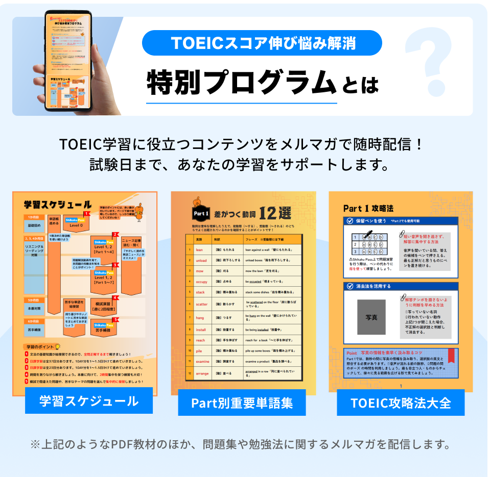 本プログラムでしか手に入らない特典教材が充実しています。Part別の頻出単語集や、講座内で紹介されている攻略法のまとめ資料など、よりTOEIC講座の内容を定着できる内容になっています。