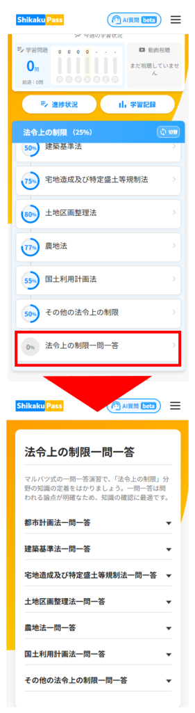 分野ごとに一問一答の問題集が追加されています。学習したい分野を選択すると一問一答のボタンが表示されます。