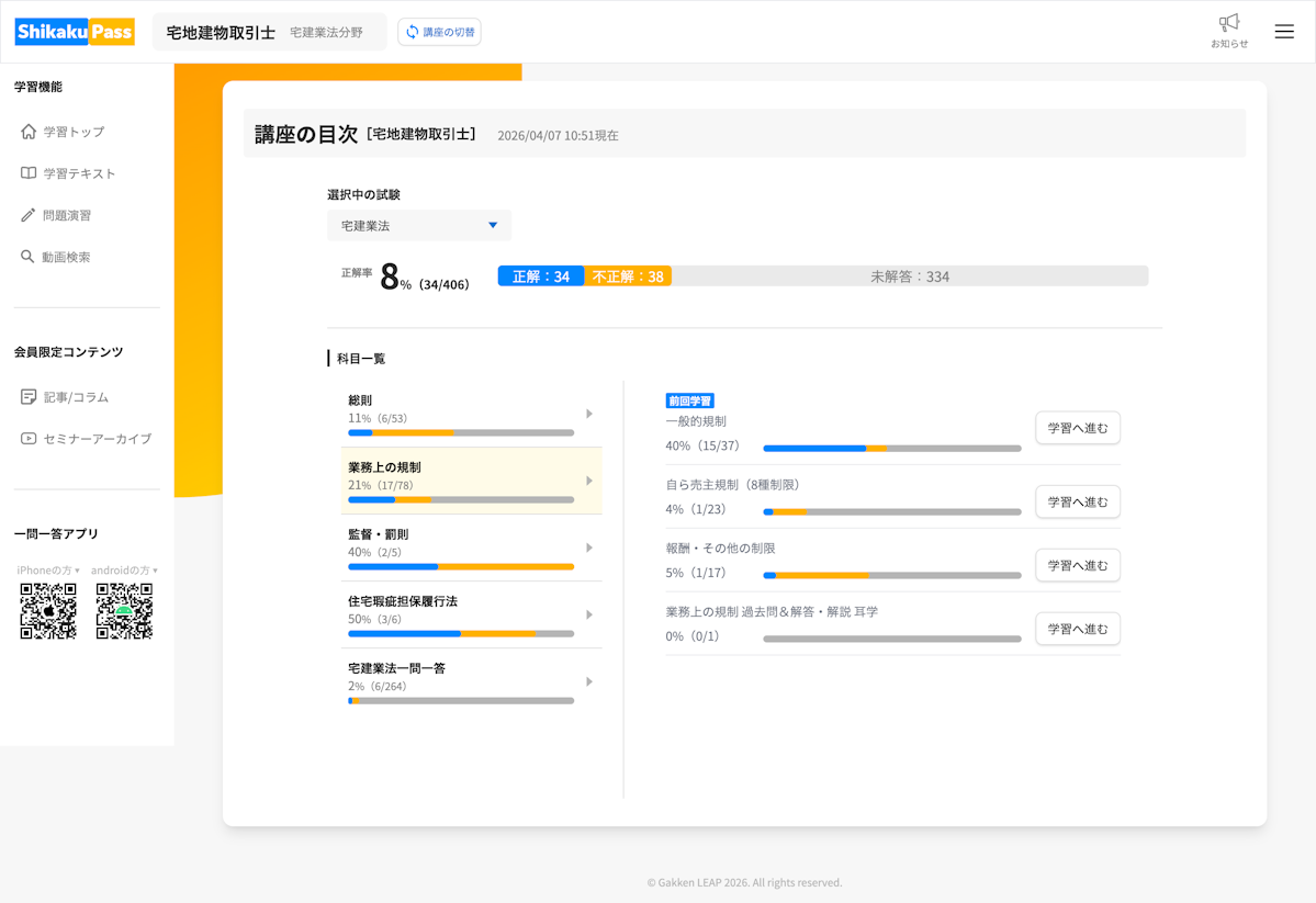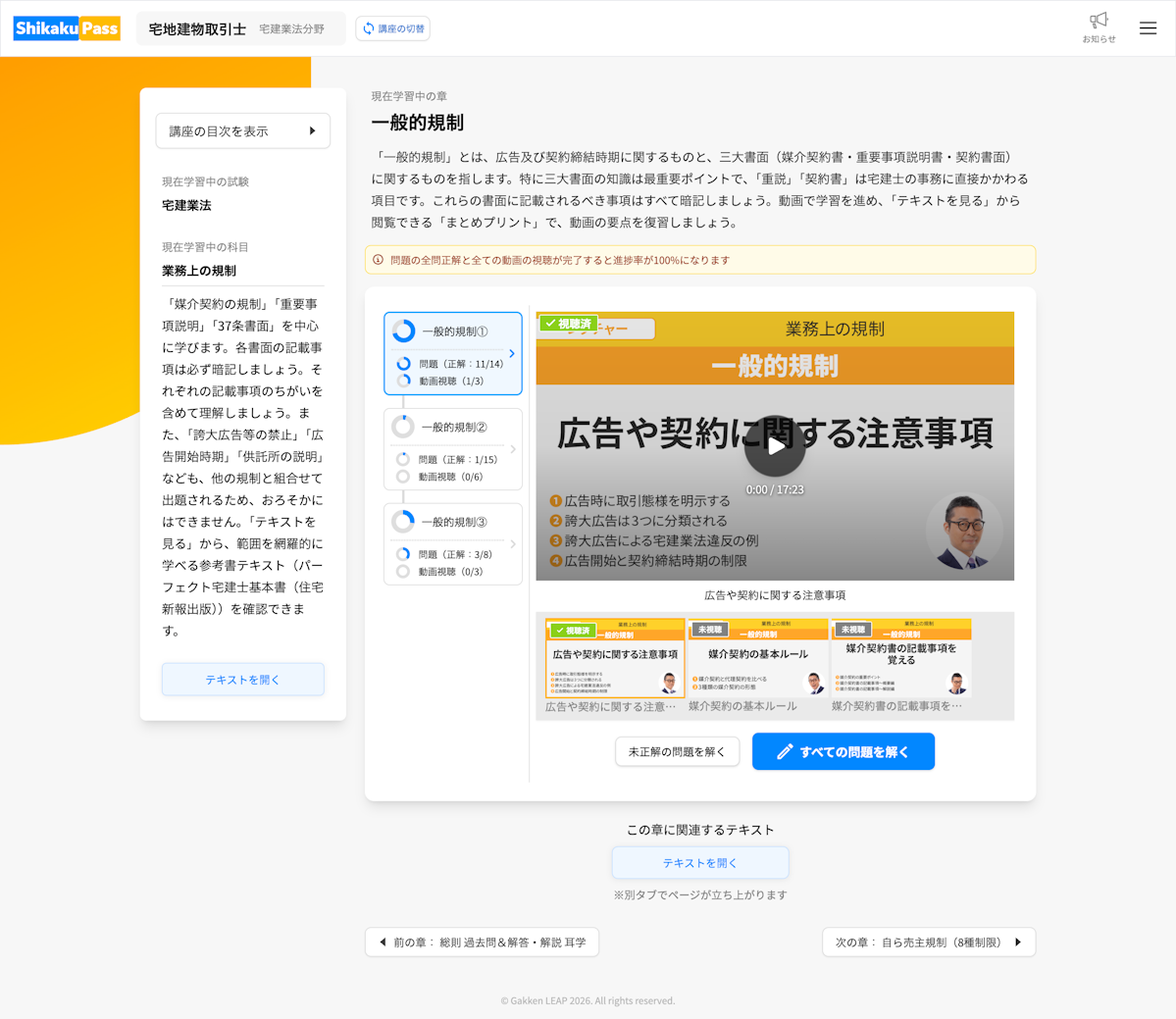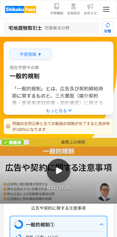 左側に試験の学習情報をまとめ、右側に今学習している内容や、動画・問題へ進む操作を配置しています。節の一覧から切り替えながら、画面の中央で動画や問題にまとめて取り組めます。
